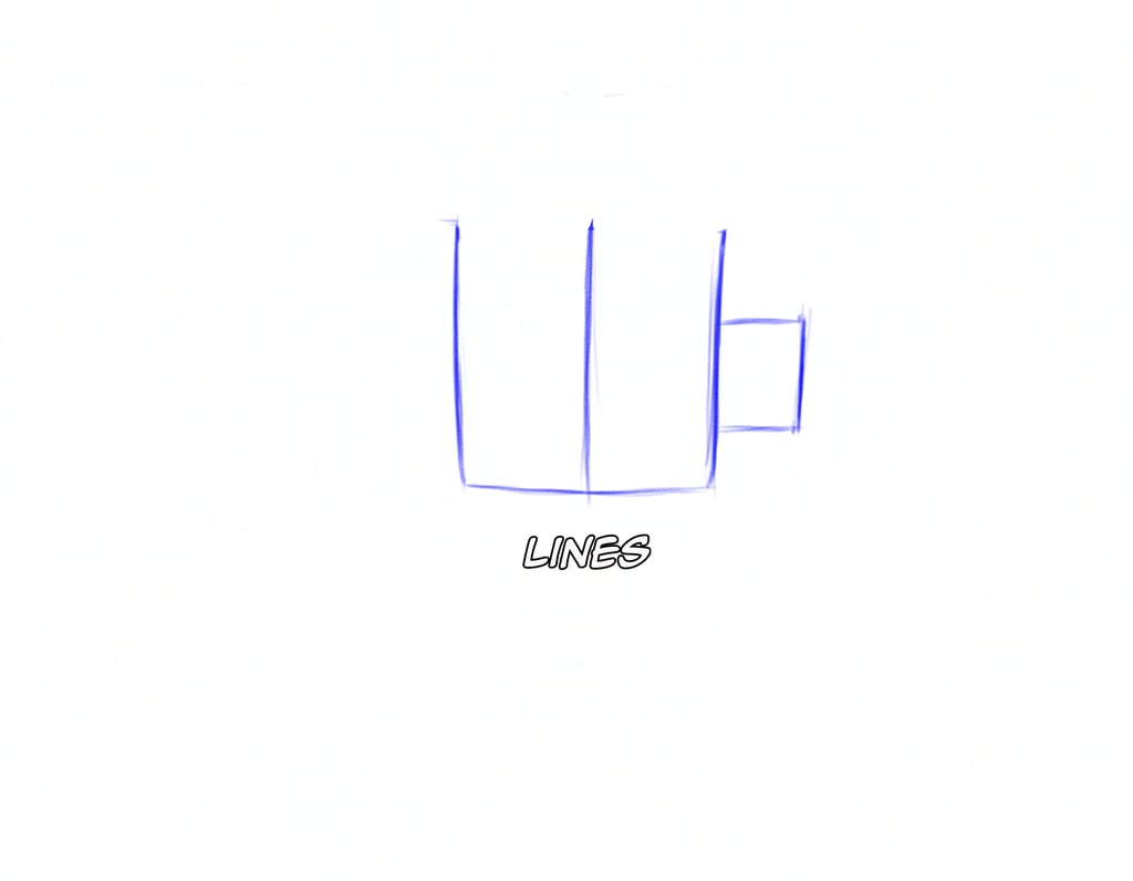 Start with light, straight lines to mark the cup’s outline and symmetry. Keep it simple — just a rectangle for the body and a smaller rectangle for the handle.