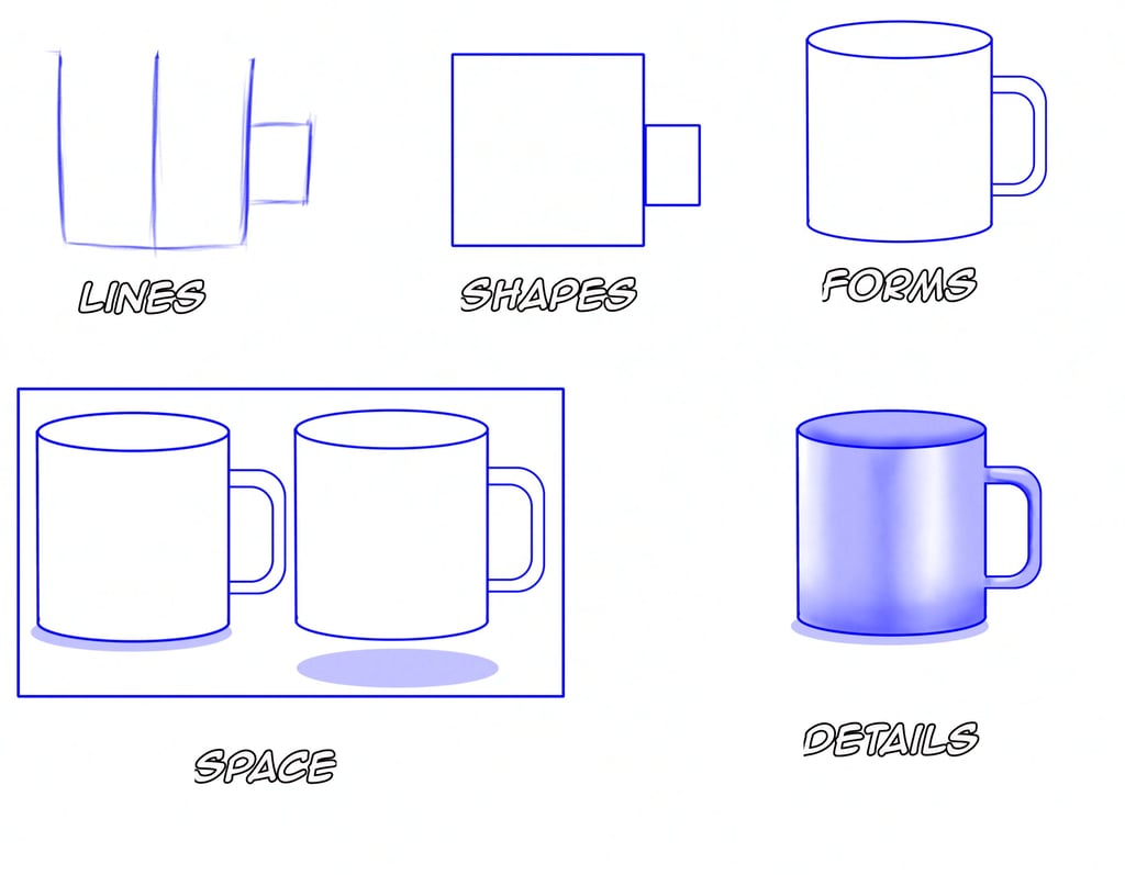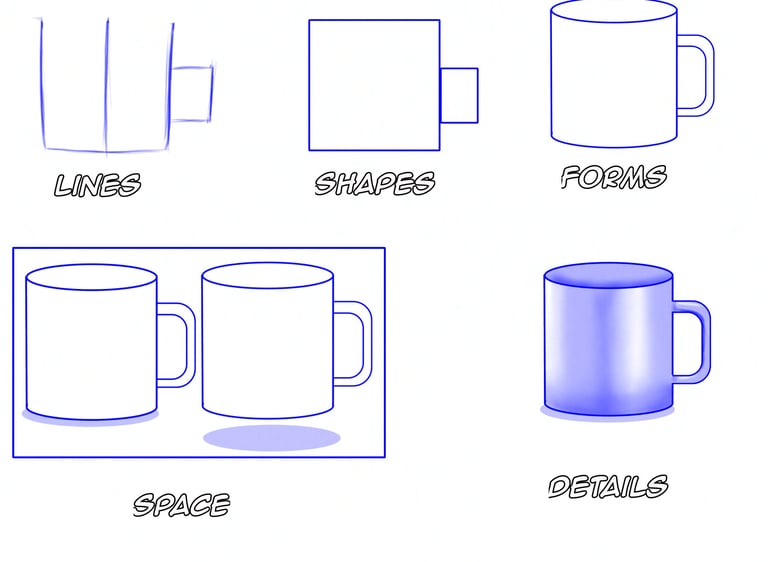 Learn the Drawing Fundamentals Pyramid step by step—Line, Shape, Form, Space, and Details—explained through a simple cup drawing example. Perfect for beginners who want to build stronger, more confident drawings.